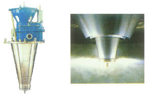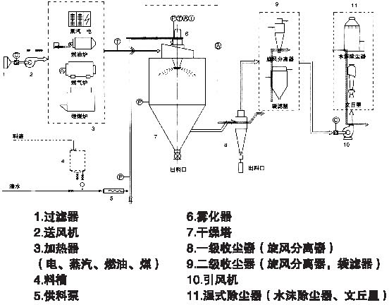 ◆ 空氣經過過濾器加熱,進入干燥器頂部的空氣分配器,熱空氣呈螺旋狀均勻進入干燥器。料液景塔體頂部的高速離心霧化器,(旋轉)噴霧成極細散的霧狀液珠,與熱空氣并流接觸在極短的時間內可干燥為成品。成品連續地由干燥塔底部和旋風分離器中輸出,廢氣由分機排空。