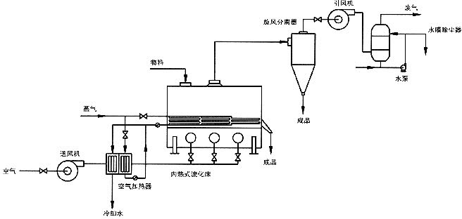 ◆ 內熱式流化床由風室、流化室、分離室和氣體分布板等構成,流化室設置有內加熱構件,熱氣體經分布板均布后進入物料層,使物料處于流化狀態,埋置在料層中的加熱元件對流化床進行補充加熱,氣固兩相通過密切接觸和傳熱傳質,實現對固體物料的干燥操作。由于干燥器所需的絕大部分熱量以加熱方式提供,隨尾氣放散的熱量大為減少,熱效率較高,干燥能耗很低。