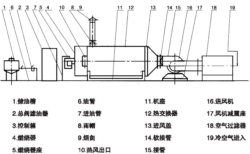 ◆ 燃料通過燃燒器燃燒,產生高溫燃氣。并借助具有強化換熱措施的熱風爐將高溫燃氣的熱量傳導給被加熱的空氣,高溫燃氣經熱量散發后溫度將低至250以下由引風機排放大氣。需加熱的空氣通過選配的鼓風機送入熱風爐吸熱后,溫度升至額定值從熱風出口處送出。當熱風溫度達到額定的上限溫度時,燃燒器會自動停止燃燒或自動轉為小火焰燃燒;當熱風溫度降低到額定的下限溫度時,燃燒器又會重新點燃運行或轉為大火燃燒,升溫的速度可以調節進風閥的開度來實現。